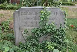 | C/159-160 | Tempel | 1913 / 1937 | Johann Tempel, 1913, Möritz, 1973 | Grab des Griesheimer Steinmetzmeisters Johann Tempel (1853–1913). Das Wanddenkmal besteht aus einer Relief- und Inschriftentafel, die von zwei durch schlanke Bronzekreuze betonten Pfeiler aus geschliffenem dunklen Biabas gefasst werden. | |