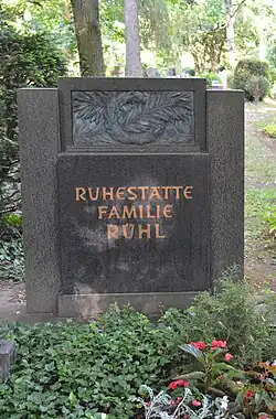 | E/150 | Rühl | 1931 | Johann Tempel | Von Eckpfeilern gefasste Wandstele aus mattgeschliffenem Diabas mit dominierendem Relief eines Kranzes, durchdrungen von Palmzweigen. | |