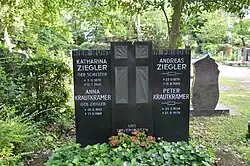 | G/6 | Ziegler | 1949 | Johann Tempel | Dreibahnige Stele mic axialem Kreuzrelief in der Tradition der 1930er Jahre aus mattgeschliffenem Diabas. | |