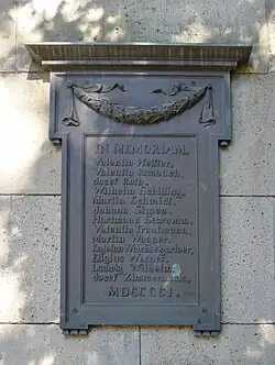 | E/160 | Schwarz | 1933 | Johann Tempel | Wandstele im Erscheinungsbild einer Ädikula aus poliertem Diabas. Im Bogenfeld befindet sich ein Kreuzrelief mit Blattschmuck. | |