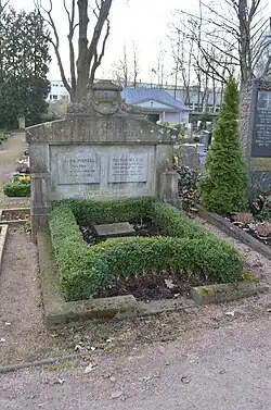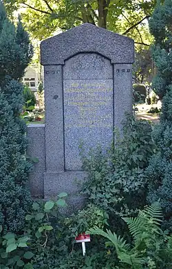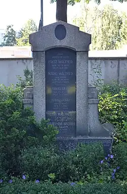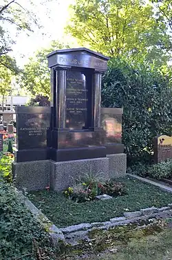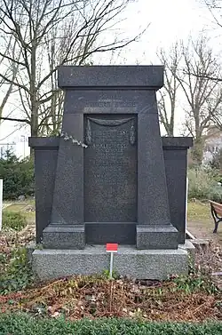 | A/18-19 | Spielmann | 1916 | F. Hofmeister | Ädikulaähnliche Stele aus poliertem schwarzen Granit mit einem geschweiften Giebel. Die Schriftspiegel sind oval und von Kranzreliefs gefasst. |