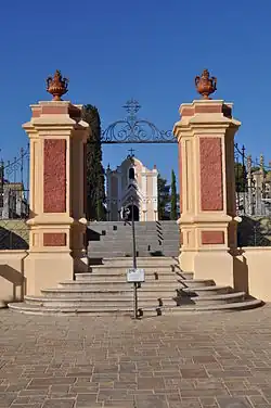 Der Eingang zum Friedhof führt über einen kleinen Platz, an dessen Kopfende sich das Eingangstor befindet. Es bildet die Mitte eines halbrunden Gitterzaunes und ist über sieben Stufen zu erreichen. Der Zaun selbst steht auf einer Ziegelmauer gleicher Höhe. Das Tor besteht aus zwei quadratischen Säulen, die von Urnen gekrönt werden. Das Tor besteht aus dem gleichen Schmiedeeisen wie der Zaun und wurde vom Kunstschmied Lluís Grau geschmiedet. Die ganze Anlage wurde nach Entwürfen von Joaquim Artau i Fábregas (1876–1946) errichtet.