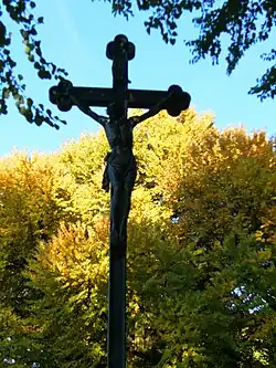 An der äußeren Friedhofsmauer entlang der Mesmerstraße sind Kopien der sieben Kreuzwegtafeln angebracht, die von Hans Müller und Ursula Batin 1657 gestiftet wurden.[2] Die Friedhofskapelle (Liebfrauenkapelle oder Kapelle Beatae Mariae Virginis) befindet sich an der Mesmerstraße/Ecke Kronenstraße. Die Wandmalereien zu Ehren Maria Himmelfahrt sind spätgotisch. Die Kapelle wurde um 1500 erwähnt und war ursprünglich als Siechenkapelle vor den Toren der Stadt für die Pestkranken und Siechen des Siechenhauses eingerichtet. Sie wurde 1682 nach der Verlegung des Friedhofs von der Pfarrkirche vor die Tore der Stadt zur Friedhofskapelle.[3]