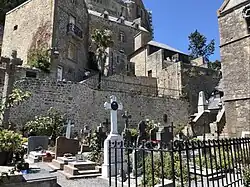 Auf dem kleinen oberen Teil des Friedhofs befindet sich als drittes Grab von Süden das Grab der am 7. Mai 1931 beigesetzten bekannten Gastwirtin Mére Poulard.[3] Im südlichen Teil erhebt sich das hohe Granitkreuz Croix de cimetière.[4]
