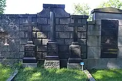 B adM 174-176 Angst 1886, 1905 (Kreuze), 1897 (Stele) F. Hofmeister (Kreuze), Gebr. Wagner (Stele) Zwei Kreuze und eine Stele vor gequaderter Wand.