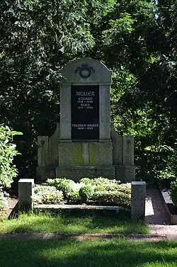 C 143-144 Niedermann-Müller-Häußer 1913 E. C. Klucken Neoklassizistische Ädikula aus grauem Granit mit Bronzekranz im Giebelfeld.