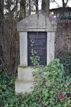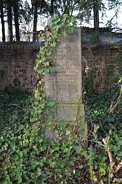 | März | 1915 | Neoklassizistische Stele in Form einer Ädikula aus gestocktem Granit mit polierter Schrifttafel, Steinmetz vermutlich J. Rumpf | |