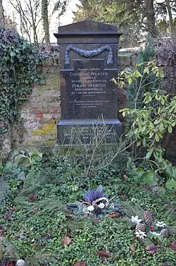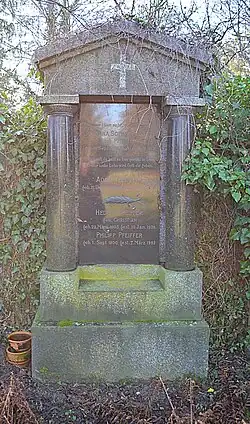 | Pfeiffer | 1912 | Neoklassizistische Ädikula aus gestocktem schwarzen Granit, Halbsäulen und polierter Schrifttafel. Steinmetze waren die Gebrüder Wagner | |