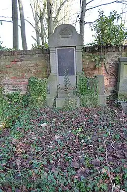 | Pfeiffer | 1914 | Neoklassizistische Wandstele aus schwarzem Granit mit unterschiedlicher Oberflächenbehandlung; zwischen Schriftspiegel und stilisiertem Giebel vermittelt ein Feston. Steinmetz Hofmeister | |