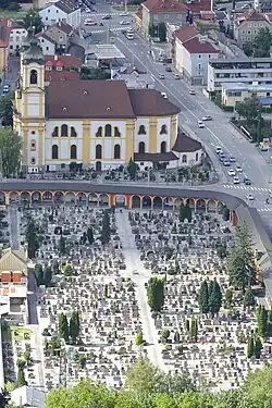 Vom nahen Bergisel mit dem Kaiserjägermuseum und der Bergiselschanze hat man einen guten Blick auf das Stift, die gegenüber liegende Wiltener Basilika und den davor liegenden Friedhof Wilten.