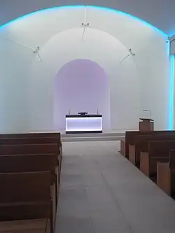 Im Zugangsbereich des Friedhofs an der Chausseestraße steht auf der rechten Seite eine Friedhofskapelle aus dem Jahr 1928.[7] Dieses kleine Bauwerk wurde nach 1990 umfassend restauriert und umgebaut und konnte am 8. Juli 2015 mit einem Gottesdienst, den Bischof Markus Dröge hielt, wieder eingeweiht werden. Zugleich wurde die vom US-amerikanischen Bildhauer und Lichtkünstler James Turrell installierte Lichtskulptur der Öffentlichkeit übergeben. In den Giebelfenstern, hinter den hohen schmalen Scheiben seitlich an der Fassade befinden sich großflächige LEDs, die mit wechselnden Farben arbeiten. Diese erstrahlen jeweils eine Stunde vor Sonnenuntergang und durchdringen den Gedenkraum im Inneren der Kapelle. In der Apsis und am Altar ist eine „schattenlos-trostspendende LED-Beleuchtung“ montiert. Im leicht aquarelligen Schein dieser Kunstinstallation finden seitdem auch Lesungen, Gedichtrezitationen und ähnliche Aktionen durch Freunde der auf diesem Gottesacker begrabenen Prominenten statt.[8]