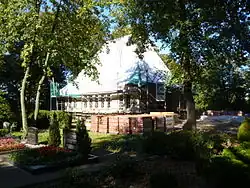 Die monumental wirkende Kapelle wurde aus Buckelquadern errichtet. Die Ecken des Gebäudes springen etwas in Form eines Risalits hervor, was der Kapelle eine wehrhafte Erscheinung gibt.[1] Es befinden sich jeweils neun schmale, rechteckige Fenster auf der Süd- und der Nordseite, wobei die mittleren fünf länger sind, als die in den Risaliten befindlichen. Der Haupteingang, auf der Ostseite, ist durch einen Steintritt erreichbar, in dem man durch einen kleinen Flur direkt in die Halle geleitet wird. In östlicher Seite befindet sich noch ein Ausgang. Besonders ist noch die Dachkonstruktion zu erwähnen.[2] Sie ist als hohes steiles Walmdach ausgeführt. 2011 wurde die Friedhofskapelle rundum saniert.[3]