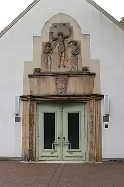 Das Hauptportal besitzt Skulpturen des britisch-deutschen Bildhauers William Ohly (1883–1955), oberhalb ist ein Auferstehungsrelief von Theobald Hauck angebracht.[2]