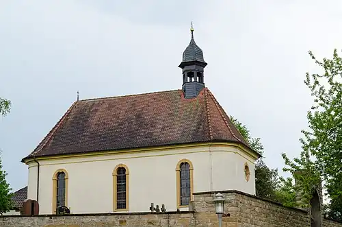 Im 17. Jahrhundert übernahm die Gottesackerkirche zeitweise die Funktionen der Pfarrkirche. Dort wurde über 50 Jahre lang Gottesdienst gehalten, weil der Turm der Bonifatiuskirche im Dorf 1638 zerstört worden war und Teile des Gotteshauses unter sich begraben hatte. Erst nach der Einweihung des Neubaus im Jahr 1690 verlor die Friedhofskapelle ihre liturgische Funktion.[1] In den Jahren 1722/1723 entstand die heutige Kapelle in Formen des Barock.[2] Die Kapelle ist als Baudenkmal eingeordnet.