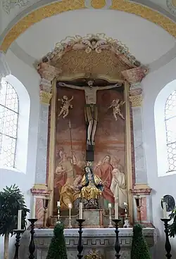 Das Deckenfresko von Franz Kirzinger zeigt die Kreuzauffindung.[2]