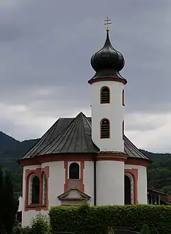 Der barocke Zentralbau mit vier Konchen besitzt im Osten einen Zwiebelturm.[1]