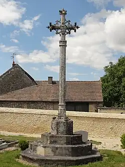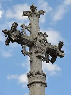 Das Friedhofskreuz ist durch einen mehrteiligen Aufbau gegliedert. Ein dreistufiger Unterbau trägt einen rechteckigen Sockel mit einer Säule, die von einem Kapitell bekrönt wird. Darauf steht das Steinkreuz im Flamboyantstil mit dem Relief des Gekreuzigten und auf der anderen Seite mit einem Relief der Pietà.