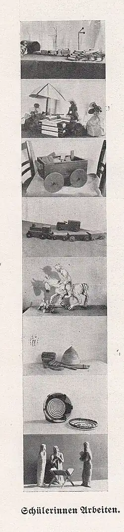 - Kinderbeschäftigung (mit Gymnastik, Turnen, Singen, Zeichnen und Basteln), Werkarbeit und Handarbeit.