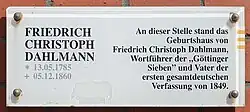 Friedrich Christoph Dahlmann (* 13. Mai 1785 in Wismar; † 5. Dezember 1860 in Bonn) war ein deutscher Historiker, Staatswissenschaftler und Staatsmann. Bekannt wurde er 1837 als einer der „Göttinger Sieben“. Später gehörte er der Frankfurter Nationalversammlung von 1848/1849 an. Als Mitglied im Verfassungsausschuss war er auch Mitverfasser der Frankfurter Reichsverfassung von 1849.
