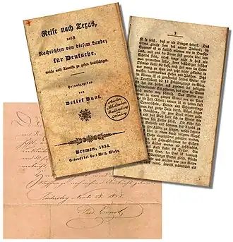 - Detlef Dunt (Hg.): Reise nach Texas, nebst Nachrichten von diesem Lande; für Deutsche, welche nach Amerika zu gehen beabsichtigen. Verlag Carl Wilhelm Wiehe, Bremen 1834