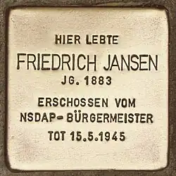 In seiner Weinhandlung trafen sich am 11. Mai 1945 Männer aus allen politischen Lagern, um die Zukunft Meldorfs zu beratschlagen. Dabei wurde beschlossen, den noch amtierenden NSDAP-Bürgermeister Ferdinand Diekmann aufzusuchen, um ihn zum freiwilligen Rücktritt zu bewegen. Sie trafen Diekmann im Garten hinter dem Rathaus vor dem Kellereingang an. Jansen begann die Verhandlungen auf plattdeutsch: „Ferdinand, wi much mol mit di snacken!“ Der Bürgermeister nahm sich die Zeit, so dass Jansen weiter ausholen konnte: „Hör mal Ferdinand, wir sind beauftragt, dich zu bitten, dass du deinen Bürgermeisterposten niederlegst.“ Diekmann antwortete jedoch empört: „Ihr Verräter! Spitzbuben!“, zückte eine Pistole und streckte Jansen mit zwei Schüssen nieder.