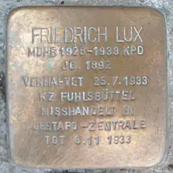 - In Hamburg wurden am 8. Juni 2012 vor dem Rathaus Stolpersteine für die ermordeten Mitglieder der Hamburgischen Bürgerschaft verlegt, darunter auch für Friedrich Lux.[2] Auch vor seiner Wohnung, Martin-Luther-Straße 7a, wurde ein Stolperstein verlegt.