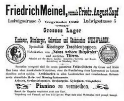 Zu dieser Zeit handelte Meinel zwar noch immer mit Musikinstrumenten, aber seit seinem Erfolg in Nürnberg galt sein kaufmännisches Interesse offensichtlich mehr der Spielwarenfabrikation und dem Handel damit. In großformatigen Anzeigen machte er auf sein „Grosses Lager an Kissinger, Nürnberger, Schweizer und Sächsischen Spielwaren“ aufmerksam. Als seine Spezialität nannte er „Kissinger Trachtenpuppen“ und verwies auf die Fabrikation von „Natura weissen Holzpferden[2] und sortierten Tieren“. Nur noch in kleinerem Text bot er darunter auch seine „Volks-Cithern für Gross und Klein“ und andere „Holz- und Messing-Instrumente“ an wie Aristons, Orchestrionetten, Xylophone, Claquebois (eine Art Xylophon[3]) und Pianinos, die er auch vermietete.