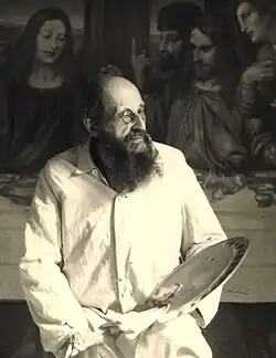 Viele Jahre seines Lebens setzte sich Friedrich Schüz mit Leonardo da Vincis Bild Das Abendmahl auseinander. Sein Verhältnis zu diesem Werk gilt als obsessiv. Als er 1908 im Auftrag des Architekten Carl Wilhelm Schleicher nach Italien gereist war, um Renaissancegemälde zu kopieren, und der Münchner Verlag Callwey ihm die Aufgabe gestellt hatte, Raphael Morghens Stich von Leonardos Abendmahl nach dem Original in Farbe zu setzen,[3] besichtigte er das Wandgemälde im Kloster Santa Maria delle Grazie in Mailand, während es in Restaurierungsarbeiten unter der Leitung von Luigi Cavenaghi (1844–1918) gesichert wurde. Der Auftrag des Callwey-Verlages an Schüz ging auf den schwäbischen Theologen und Pfarrer David Koch (1869–1920) zurück, der seinerseits durch Otto Hoerths 1907 veröffentlichte Dissertation Das Abendmahl des Leonardo da Vinci[4] zu der Idee einer Rekonstruktion des Gemäldes gekommen sein mag. Koch, der 1905 eine Biografie von Schüz’ Vater Theodor publiziert hatte, begleitete Schüz bei der Besichtigung im Jahr 1908. Auf der Grundlage von Hoerths Schrift recherchierte Schüz ab etwa 1909 sämtliche frühe Wiedergaben des Abendmahls. Bei diesen Nachforschungen unternahm er Reisen zur Royal Academy of Arts nach London, zur Abtei Tongerlo, in den Pariser Louvre, zur Kirche des Hl. Ambrogio in Ponte Capriasca, nach Straßburg und Freiburg im Breisgau. Zwischen 1909 und 1917 fertigte er auf der Grundlage seiner Studien eine auf die Hälfte verkleinerte Rekonstruktion von Leonardos Abendmahl für den Gemeindesaal der evangelischen Auferstehungskirche in Düren in den Maßen 450 × 225 cm in Ölmalerei an. Den Auftrag hatte Schüz von dem Kommerzienrat Heinrich Schoeller (1851–1924) und dessen Ehefrau erhalten. Schoeller war hierzu wiederum von seinem Vetter, dem Architekten Carl Wilhelm Schleicher, angeregt worden. Das gerahmte Gemälde wurde auf der großen Leonardo-Ausstellung, die vom 9. Mai bis 20. Oktober 1939 im Palazzo dell’Arte in Mailand veranstaltet wurde, ausgestellt. Im Zweiten Weltkrieg wurde es beim Luftangriff vom 16. November 1944 auf Düren zerstört.[5]