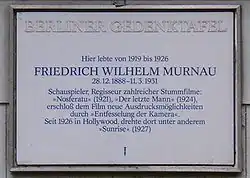 Friedrich Wilhelm Murnau, auch F. W. Murnau, (* 28. Dezember 1888 als Friedrich Wilhelm Plumpe in Bielefeld; † 11. März 1931 in Santa Barbara, Kalifornien) gilt als einer der bedeutendsten deutschen Filmregisseure der Stummfilmära. Sein vom Expressionismus beeinflusstes Schaffen, seine psychologische Bildführung und die von ihm angewandte, damals revolutionäre Kamera- und Montagearbeit eröffneten dem jungen Medium Film neue Möglichkeiten. Zu seinen berühmtesten Werken zählen Nosferatu – Eine Symphonie des Grauens (1922), Der letzte Mann (1924), Faust – eine deutsche Volkssage (1926) und Sonnenaufgang – Lied von zwei Menschen (1927).