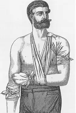 Gemeinsam mit dem „Irrenarzt“ Peter Willers Jessen stellte er auf der Grundlage klinischer Studien 1857 als Erster die Vermutung auf, dass Syphilis Ursache der Neurolues sei.[8] Im Deutsch-Französischen Krieg war er beratender Chirurg der Preußischen Armee. Er entwickelte sich zu einem der bedeutendsten Chirurgen des 19. Jahrhunderts. Auf ihn geht das Dreiecktuch zur Stütze bei Armverletzungen zurück und er entwickelte zwei wichtige Verfahren, die bis heute angewandt werden und seinen Namen tragen, den Esmarch-Handgriff[9] und die 1873 publizierte[10] „Esmarchsche Blutleere“,[11] bei der die Extremitäten mittels einer elastischen Gummibinde ausgewickelt werden, wodurch der Blutverlust während Operationen reduziert werden kann.[12] Die auf den von Etienne J. Morel (1674) angewandten Knebel zurückgehende künstliche Blutleere erkannte Esmarch in ihrer Bedeutung für die Versorgung von ausgedehnten Weichteilverletzungen.[13]
