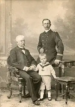 Friedrich von Kühlwetter (Mitte) gemeinsam mit seinem Vater Friedrich von Kühlwetter (1836–1904, sitzend) und seinem Sohn Friedrich von Kühlwetter (1894–1978), um 1898.
