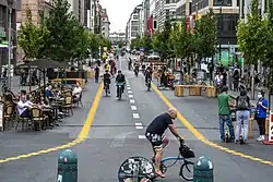 Im Jahr 2019 gab es einige Herausforderungen der wirtschaftlichen Entwicklung der Friedrichstraße,[10] die die Planer mit der Verkehrsführung in Zusammenhang brachten. Deshalb wurde im August 2020 erstmals eine Geschwindigkeitsbegrenzung von 20 km/h auf dem Fahrradweg der Friedrichstraße eingeführt.[11] Das brachte aber keine wesentliche Verbesserung, weil das Problem nicht die schnelleren Radfahrer waren, sondern der intensive Autoverkehr. Aus diesem Grund wurde ab dem 29. August 2020 die Friedrichstraße in dem Abschnitt zwischen Leipziger Straße und Französischer Straße eine autofreie Zone.[12] Das Projekt des Berliner Senats diente der Erprobung, wie eine autofreie Stadt die Lebensqualität steigern könnte. Das ursprünglich bis Januar 2021 geplante Projekt wurde dann bis Oktober 2021 verlängert. Am 15. Oktober 2021 erklärte die neugebildete Senatsverwaltung für Umwelt und Verkehr, dass der Verkehrsversuch nach den Ergebnissen einer Zwischenauswertung erfolgreich gewesen sei. Die Verkehrsverwaltung wollte nun beim Bezirk einen Antrag für eine dauerhafte autofreie Zone stellen, bis zur Entscheidung bleibe der Abschnitt weiterhin autofrei.[13] Reinhard Mohr kritisierte die Umgestaltung 2021 in der Zeitung Die Welt als das „deutsche Bullerbü“.[14] Eine Studie ermittelte 2022, dass die Zahl der Besucher seit der Umgestaltung um 65 % zugenommen hat.[15] Allerdings werden als Referenzwert nicht Daten aus den Vorjahren, sondern aus den ersten fünf Monaten des Corona-Lockdown verwendet. Eine andere in der Berliner Morgenpost zitierte Studie konstatierte im April 2022, dass die Friedrichstraße „schlecht abschneide“ und „Besucher verliere“. Das Berliner Verwaltungsgericht entschied zum 31. Oktober 2022 nach der Klage einer Weinhändlerin, die in der parallel verlaufenden Charlottenstraße unter erhöhtem Straßenverkehr litt, dass die oben beschriebene „Überbrückungsanordnung“ nach dem Abschluss des Verkehrsversuchs rechtswidrig ist.[16][17] Zunächst sollte Beschwerde eingelegt werden, wovon der Senat dann aber absah. Ab 22. November 2022 wurde die Friedrichstraße für den Autoverkehr in beiden Richtungen wieder geöffnet. Am 27. Januar wurde die erneute Sperrung der Straße für den Autoverkehr (Teileinziehung) angekündigt[18] und am 30. Januar die Sperrung durchgeführt. Etwa gleichzeitig wurde damit begonnen, die zur Friedrichstraße parallel verlaufende Charlottenstraße zur Fahrradstraße umzugestalten.[19] Laut einer Forsa-Umfrage Anfang 2023 befürworteten nur 37 % der wahlberechtigten Berliner die autofreie Umgestaltung.[20] Anfang Juli 2023 wurde sie erneut für den Autoverkehr geöffnet, daraufhin verhinderte die Letzte Generation zusammen mit den „Eltern gegen die Fossilindustrie“ kurzzeitig den Kraftfahrzeugverkehr durch eine Straßenblockade.[21]