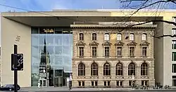- Die verkauften Bürogebäude am Fürstenwall östlich vom Kirchplatz wurden nach 2012 zuerst von der Portigon AG weiterbenutzt. Nach dem Auszug einer ersten Tochterfirma der Portigon, der „Portigon Financial Services“, Ende 2013 wurden Teile des Komplexes umgebaut und sind seit 2014 Sitz des NRW-Innenministerium am Standort Friedrichstraße Nr. 62–80.[53] Seit dem Auszug der Portigon Ende 2016 sind die letzten Aktivitäten der ehemaligen WestLB an der Friedrichstraße erloschen.