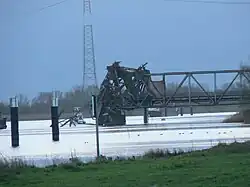 Zeitweise war die Friesenbrücke die längste Eisenbahnklappbrücke in Deutschland.[12] Mitte April 1945, kurz vor Ende des Zweiten Weltkriegs, wurde sie von Wehrmachtsoldaten gesprengt, um die heranrückenden kanadischen Soldaten an der Ems aufzuhalten.[9]