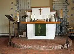 Der Altarraum hat mit seinem weiß-blauen Fliesenkreuz aus Delfter Kacheln einen authentisch friesischen Wandschmuck.
