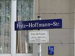 • Fritz Hoffmann. In: Museum für Geschichte der Stadt Dresden: Biografische Notizen zu Dresdner Straße und Plätzen, die an Persönlichkeiten aus der Arbeiterbewegung, dem antifaschistischen Widerstandskampf und dem sozialistischen Neuaufbau erinnern. Dresden 1976, S. 40.