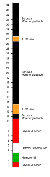 Mit Trainer Hennes Weisweiler und Spielmacher Günter Netzer gewann Borussia Mönchengladbach vor Titelverteidiger Bayern München seinen ersten Meistertitel. Bis 1977 sollten noch vier weitere Meisterschaften hinzukommen.