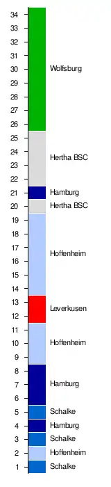 | 1. | VfL Wolfsburg | 34 | 21 | 6 | 7 | 80:41 | +39 | 69 |