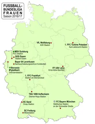 Die Saison 2016/17 war die 27. Spielzeit der Bundesliga, offiziell Allianz Frauen-Bundesliga, im Frauenfußball. Die Saison begann am 3. September 2016 und endete mit dem letzten Spieltag am 21. Mai 2017.[1] Meister und Vizemeister qualifizieren sich für die UEFA Women’s Champions League, während die zwei letztplatzierten Mannschaften in die 2. Bundesliga absteigen müssen. Titelverteidiger war der FC Bayern München. Aufsteiger aus der 2. Bundesliga 2015/16 waren der MSV Duisburg, welcher den direkten Wiederaufstieg geschafft hat, und Borussia Mönchengladbach.