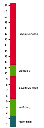 Am 17. Spieltag gewann der FC Bayern mit 4:0 in Wolfsburg, womit die Münchnerinnen den Vorsprung an der Spitze deutlich ausbauen konnten.[19]