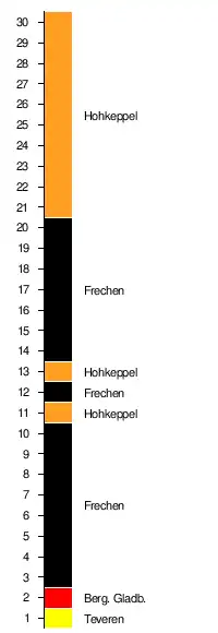 | SpVg Frechen 20 | 3:1 | 2:1 | 0:2 | 0:3 | 0:3 | 0:0 | 3:1 | 3:1 | -:- | 3:0 | 6:1 | 3:2 | 6:0 | 3:0 | 9:0 | |||