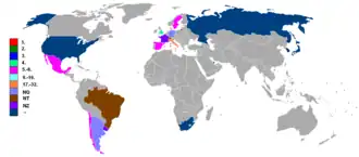 - Nicht zugelassen: 3× (13,6 %; 1930, 1934 und 1938)