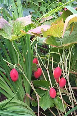 Blätter und reife Früchte des Himalaya-Fußblattes (Podophyllum hexandrum)