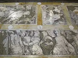 Die 1481 entstandene und 1482 bezahlte Szene wurde von Francesco di Niccolaio und Nanni di Piero di Nanni nach einem Entwurf von Matteo di Giovanni gestaltet und 1790 von Matteo Pini und Carlo Amidei restauriert. Die lebendige Szene spielt sich vor einem hufeisenförmigen Portikus ab, auf dem sich ein wertvolles Fries aus Duellanten im klassischen Stil befinden. Auf runden Balkonen verfolgen einige Zuschauer die Veranstaltung mit einem Hauch von Selbstzufriedenheit und Spaß, als wären sie im Theater. König Herodes sitzt auf einem prächtigen Renaissance-Thron aus geschnitztem Marmor und befehligt seinen Soldaten das Massaker. Die Technik unterscheidet sich von derjenigen im Kirchenschiff, indem eine größere Anzahl farbiger Marmore verwendet wird, um Schatten- und Lichtbereiche zu schaffen. Nach einem Verfahren, das perfektioniert wird und das in den von Beccafumi entworfenen Szenen seinen Höhepunkt findet. |