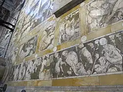 Tod von Abschalom | Piero del Minella (Entwurf) | 1447 | ? | Umrahmt von gotischen dreiteiligen Hängebögen, zeigt es die Strafe für Abschalom, Davids rebellischen Sohn, der floh und sich mit seinen Haaren in einem Baum verfangen hat, wo er von den Anhängern seines Vaters eingeholt und getötet wurde. Die Geschichte wird durch die Inschrift verdeutlicht, die zur Basis der Szene führt: absalon vidi pender pe' capelli, poi che fedò la camera paterna, e tucto era 'nflizato di quadrelli. Um die hängende Figur von Abschalom herum stehen zwei Gruppen von Kriegern, die idealerweise durch die Linien der Speerstäbe verbunden sind, die den Prinzen durchdringen. Der Stil zeichnet sich durch eine klare kompositorische Klarheit aus, mit einigen gotischen Stilelementen, wie den eher nervösen Konturlinien und der Formgebung der Natur, wie die Blätter der Bäume, die einzeln dargestellt werden. Es ist das Werk von Pietro del Minnella, dem Baumeister des Doms, der auch in Orvieto tätig war und es 1447 schuf. |