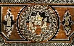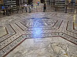 Der Fußboden des Domes von Siena ist eines der größten und wertvollsten Beispiele für eine Gruppe von Marmoreinlagen, ein schmückendes Projekt, dessen Fertigstellung sechs Jahrhunderte, vom 14. bis zum 19. Jahrhundert, dauerte. Wie der Dombau ist der Boden untrennbar mit der Geschichte der Stadt und ihrer Kunst verbunden. Aus diesem Grund haben die Sienesen im Laufe der Jahrhunderte keine Ressourcen für ihre Entstehung und dann für ihre Erhaltung geschont. Sie besteht aus mehr als sechzig Szenen und sind in der Regel in den am häufigsten begangenen Stellen mit Masonit abgedeckt, außer einmal jährlich für etwa zwei Monate, zwischen Ende August und Ende Oktober.[1]