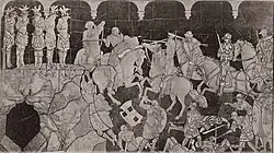 Selbst auf einem Schlüsselwerk wie dem Boden des Doms wird daher auf den Traum von Macht und Größe der Sienesen, damals der größte Staat der Toskana, durch die Kampfszenen des jüdischen Volkes verwiesen, in denen sie ihre eigenen Ereignisse verklären können.[8]