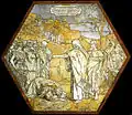 1878 | König Ahab trat in den Krieg ein und holte einige Siege. Aber er begeht ein schweres Verbrechen, indem er Nabot tötet, einen Mann, der einen Weinberg in der Nähe seines Palastes hatte, um diesen in Besitz zu nehmen. Zu diesem Zeitpunkt sagt Elija seinen bevorstehenden Tod voraus. Die Szene zeigt den niedergeschlagenen König zu Füßen des Propheten (1. Könige, 21, 21–22). Die vielleicht emotionalste von Franchis Szenen zeichnet sich, wie die anderen Sechsecke an die er arbeitete, durch die Verwendung der Farben Weiß, Gelb und Blau für die Mosaike aus. Nach der traditionellen Technik wurde eine Schraffur hinzugefügt, indem Rillen mit schwarzem Pech gefüllt wurden. |