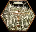1524 | Im zentralen Sechseck sind die Figuren von König Ahab links und Elija rechts zu sehen, umgeben von zwei symmetrischen Personengruppen, die groß, schlank und mit eleganter Kleidung sind, insbesondere der königlichen, die einen Turban, weite Ärmel und Pelzbesatz haben. Elija weist auf einen Hügel, auf dem ein durch Dürre zerstörter Baum steht und auf dem sie zwei Ochsen schleppen, um sie zu opfern. Der eine wird Baal von seinen Priestern und der andere Gott von Elija dargebracht, damit der König in Gegenwart des ganzen Volkes sehen kann, welcher Kult wahr und welcher fiktiv ist (1. Könige, 18, 17–19). Im Hintergrund sieht man die Mauern der Stadt. Dies war das letzte Sechseck, das von Beccafumi ausgeführt wurde, bezahlt am 18. Juni 1524. Hier nahm der Künstler die Motive der Bodenszenen des 15. Jahrhunderts mit einem Himmel aus schwarzem Marmor auf. |