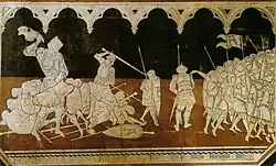 Josua schlägt die Amoriter | Sassetta (Entwurf), Paolo di Martino (Ausführung) |